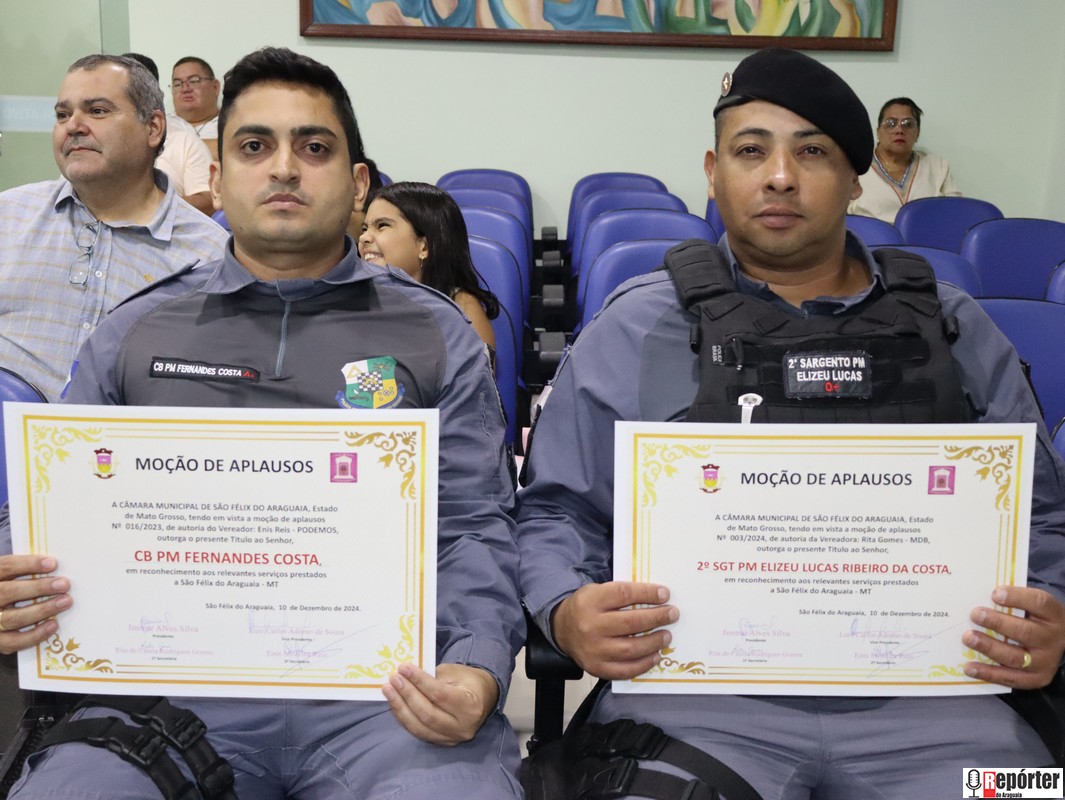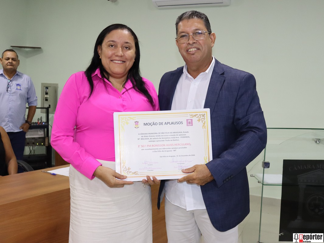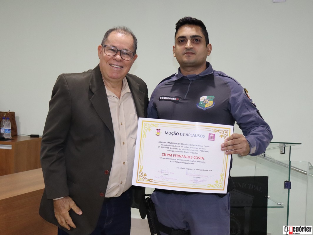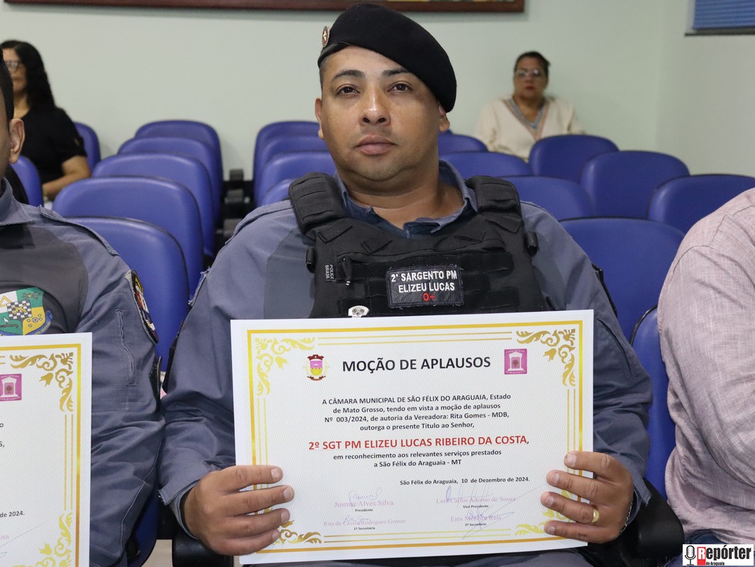 O 2º SGT-PM, Elizeu Lucas Ribeiro Costa que foi homenageado com uma Moção de Aplauso pelos relevantes serviços prestados a sociedade nas atividades desenvolvidas sempre em favor da sociedade e do bem comum recebeu das mãos da vereadora autora da indicação Rita Gomes (MDB) a Moção de Aplauso em reconhecimento do seu trabalho.